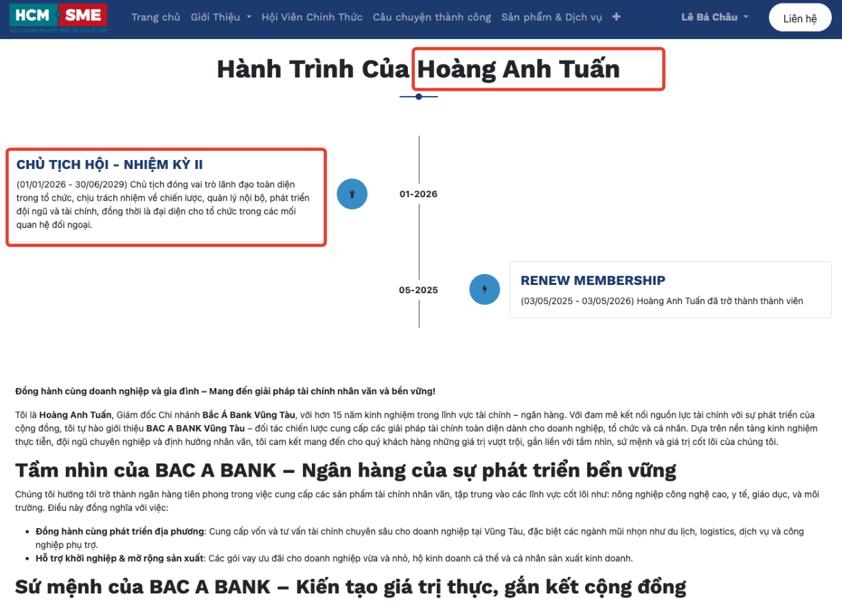 - Website lưu giữ hành trình tham gia hiệp hội một cách chi tiết và minh bạch – từ ngày gia nhập đến các đóng góp nổi bật, tạo nên “bộ hồ sơ thành tựu” giá trị để hội viên khẳng định sự cống hiến.